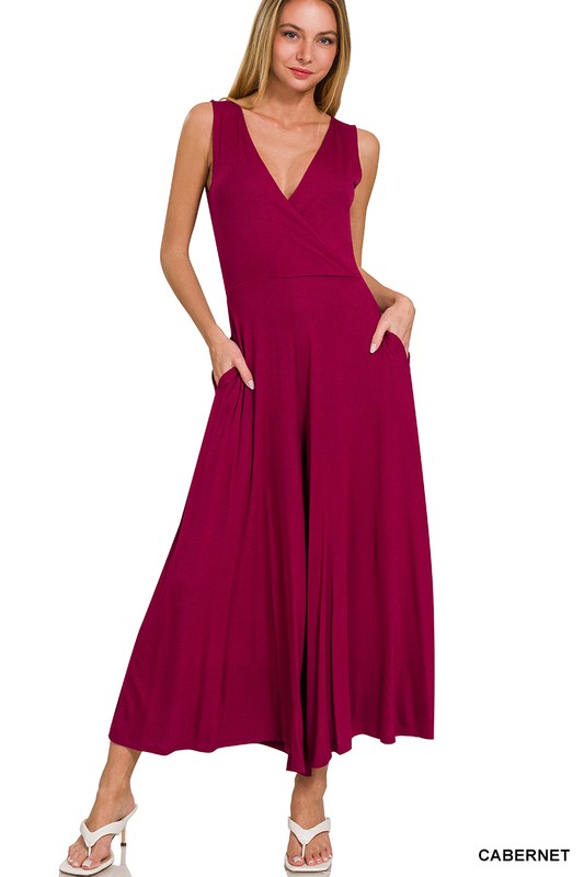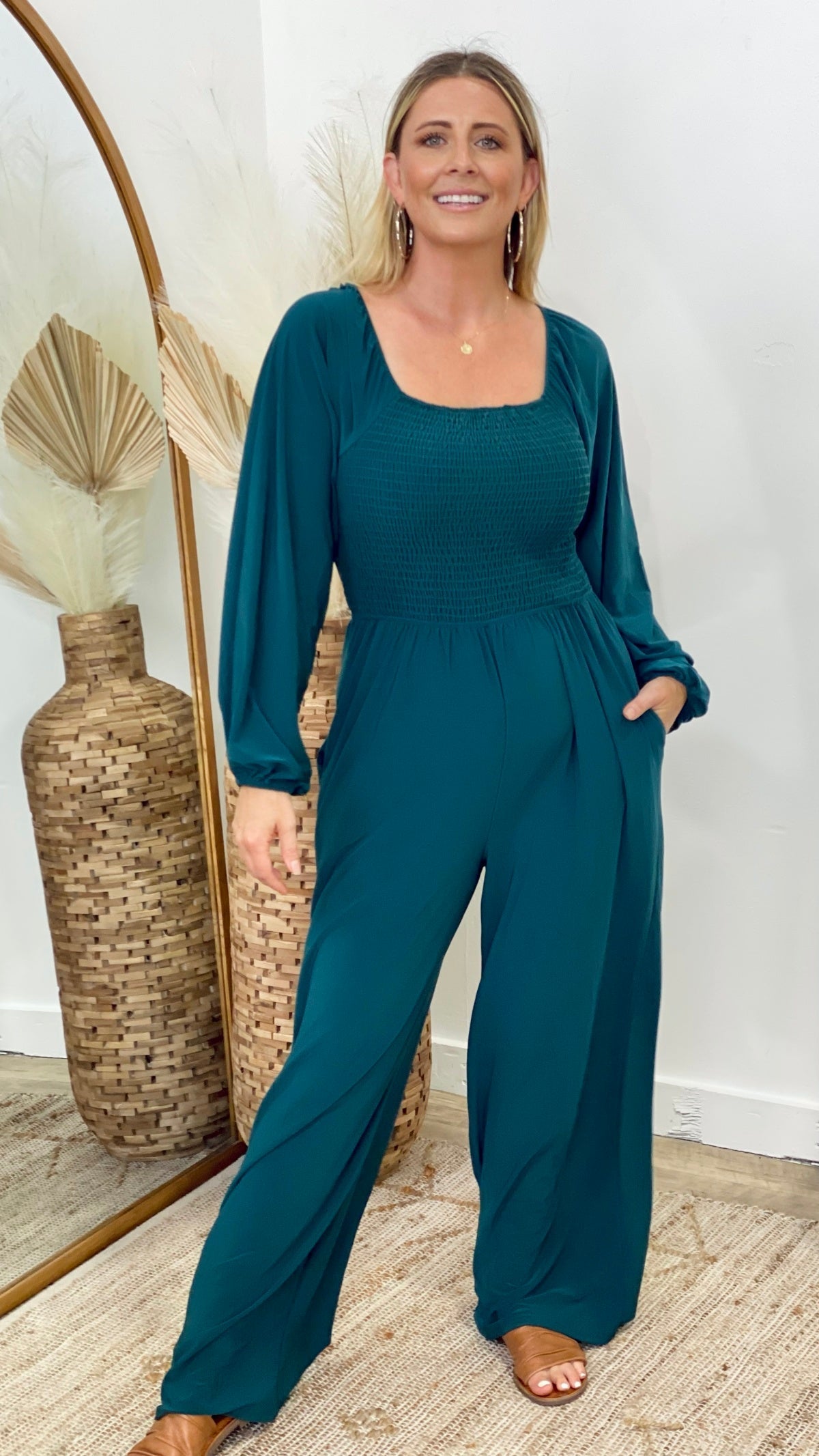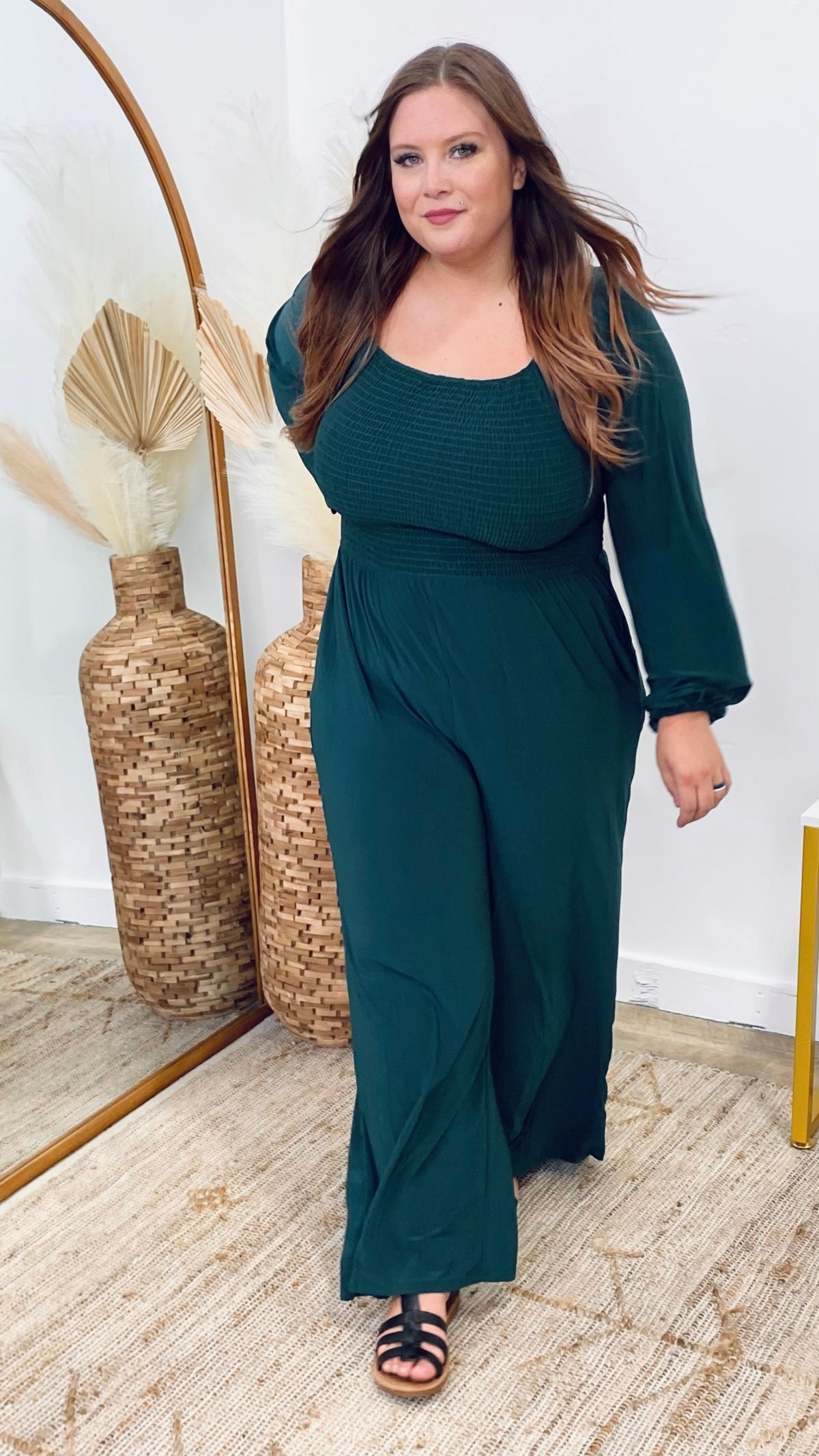 Smocked Gathered Wide-Leg Solid Knit Jumpsuit