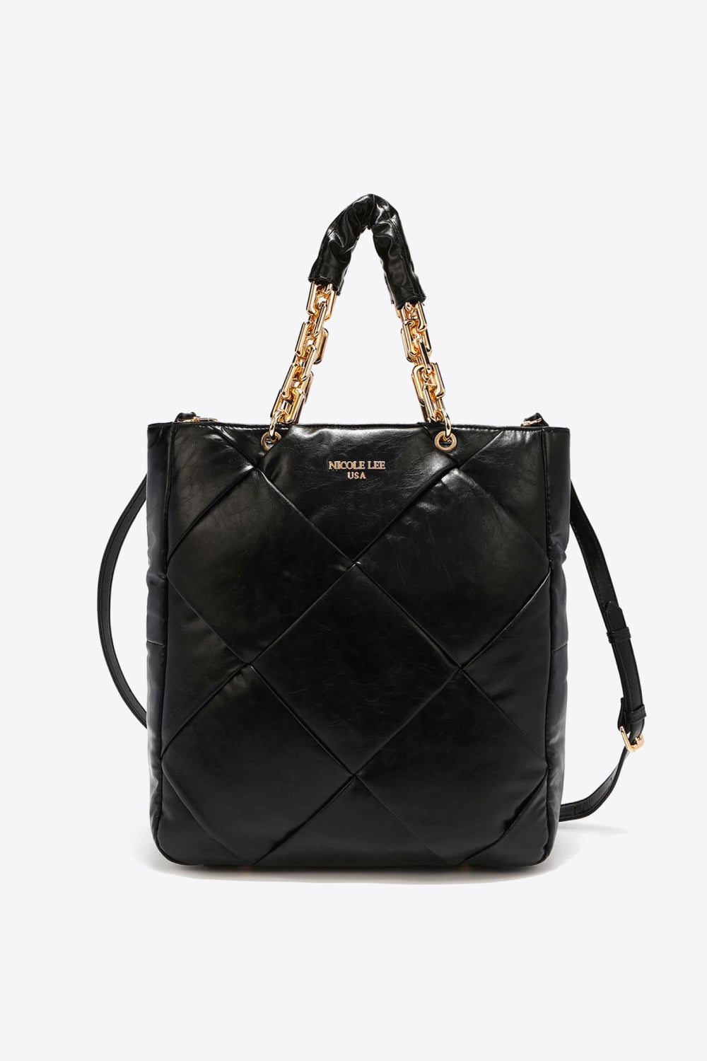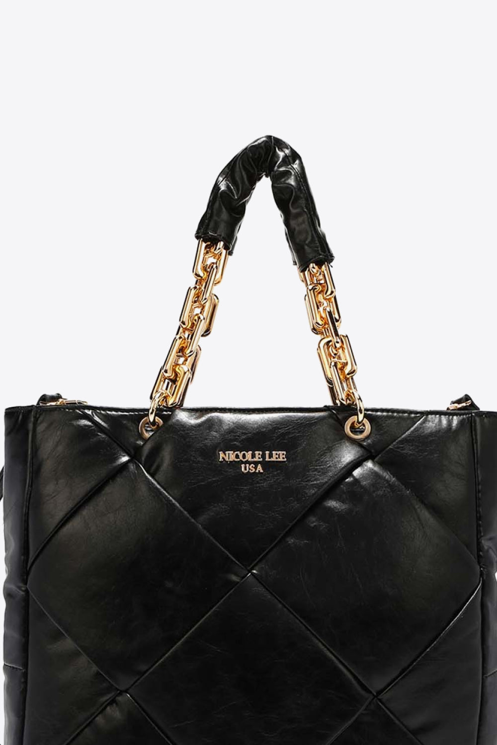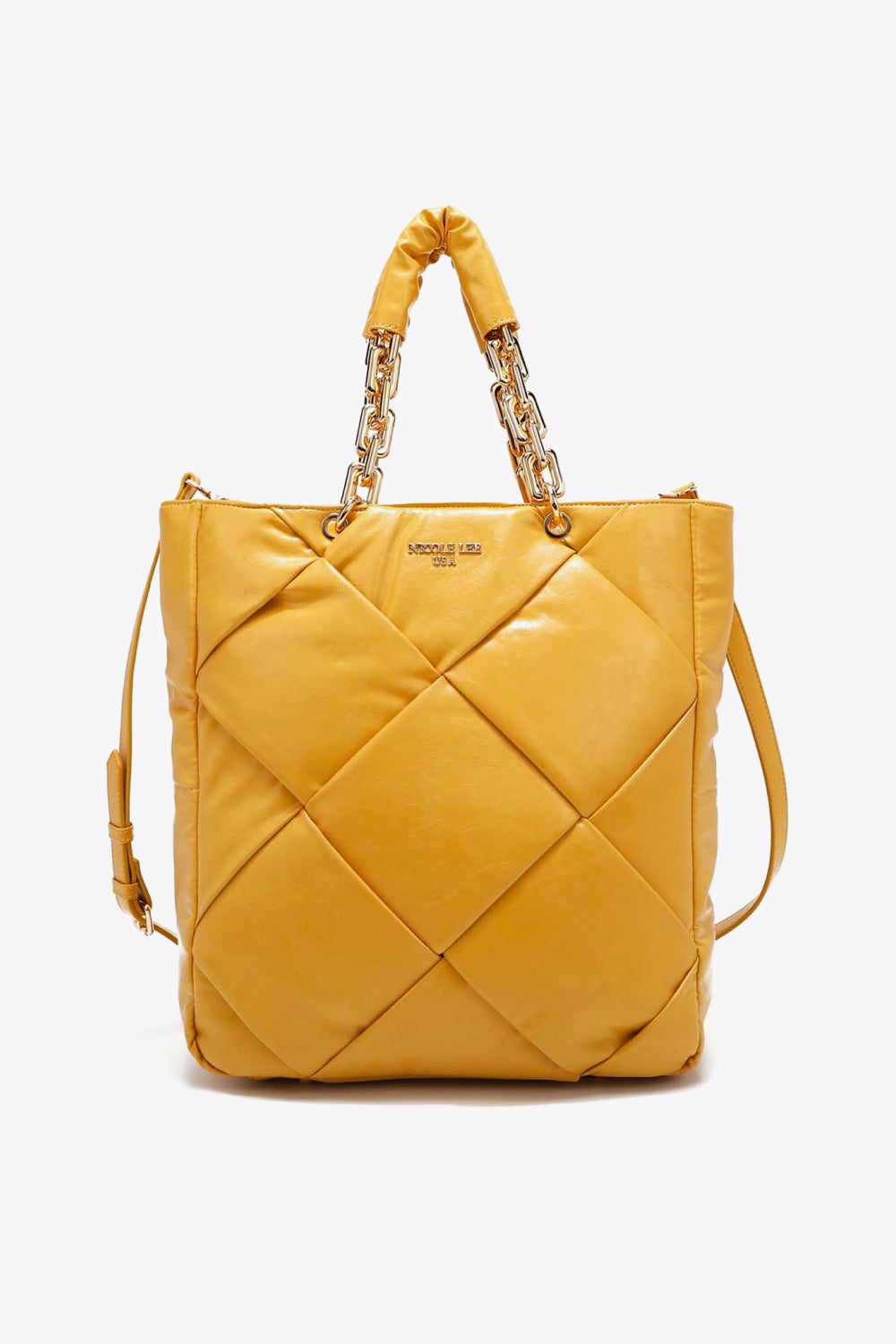 This gorgeous bag is made with a luxurious vegan leather exterior featuring an intricate woven pattern that exudes elegance and sophistication. The bag is designed with a sturdy chain link top handle that comes with vegan leather padding, providing a comfortable 8-inch drop for easy carrying. For added convenience, the bag features a recessed zip top closure that keeps your belongings safe and secure. The bag also includes D-rings for optional strap attachment, giving you the flexibility to switch between carrying options. The metal feet at the base of the bag provide added protection to keep your bag looking brand new for longer. The bag's logo hardware lettering and engraved zipper pulls add a touch of glamour to the overall design, while the gold-tone hardware further enhances the bag's luxurious appeal.