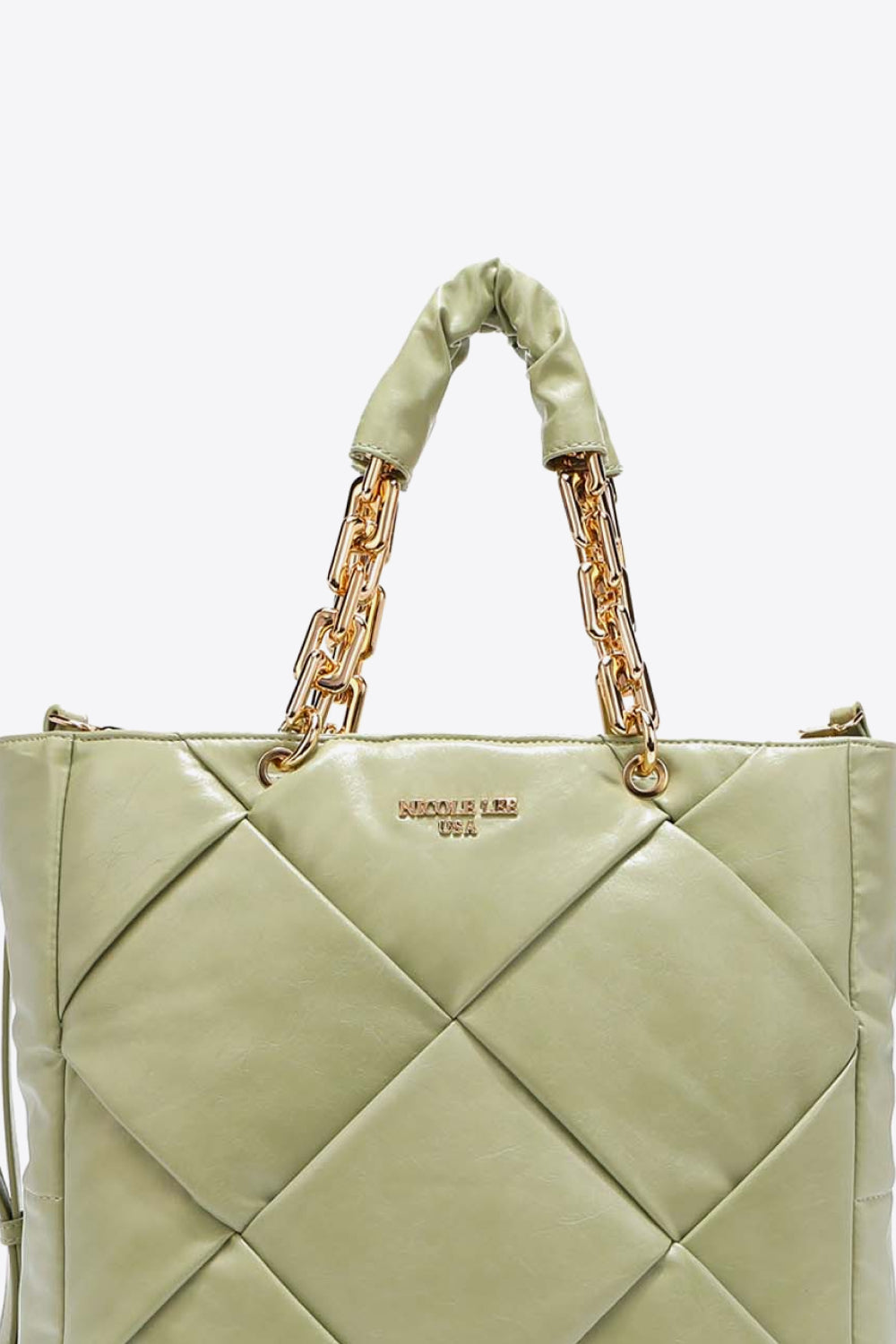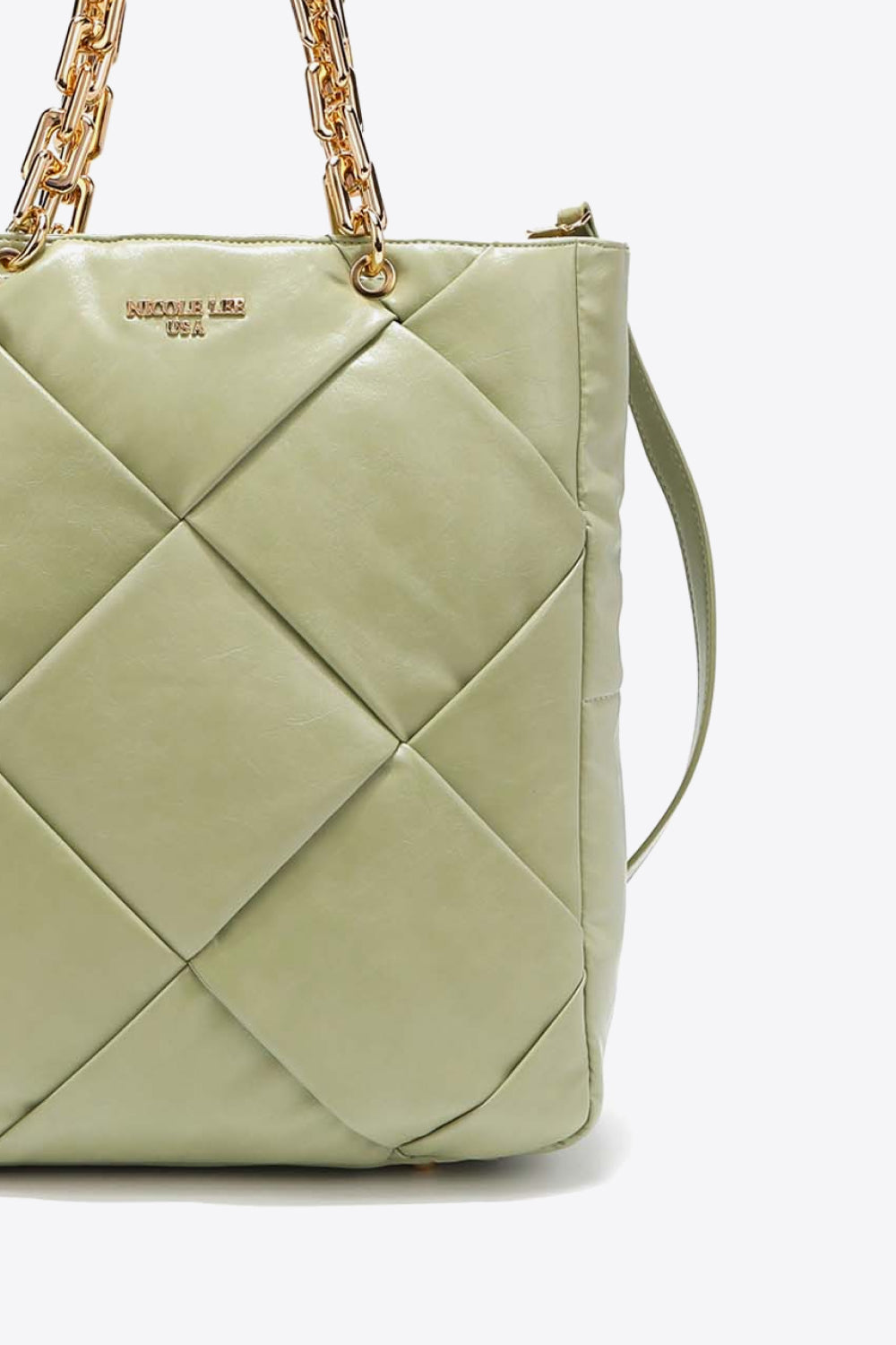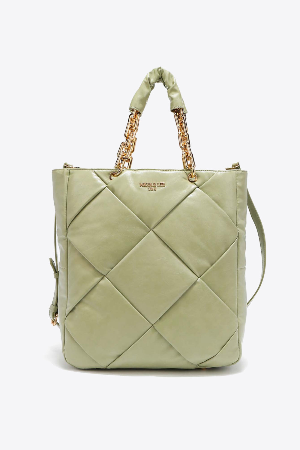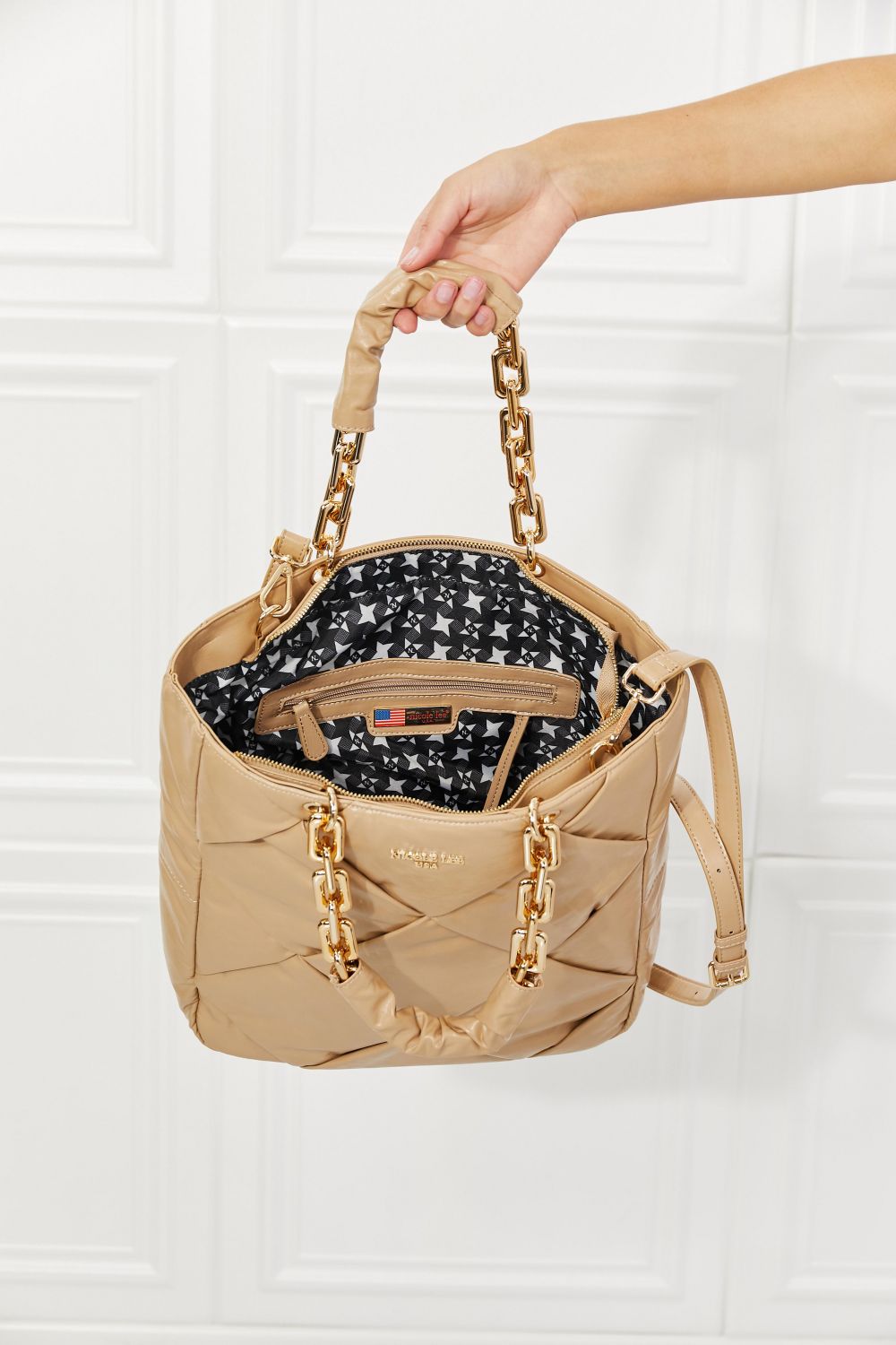 This gorgeous bag is made with a luxurious vegan leather exterior featuring an intricate woven pattern that exudes elegance and sophistication. The bag is designed with a sturdy chain link top handle that comes with vegan leather padding, providing a comfortable 8-inch drop for easy carrying. For added convenience, the bag features a recessed zip top closure that keeps your belongings safe and secure. The bag also includes D-rings for optional strap attachment, giving you the flexibility to switch between carrying options. The metal feet at the base of the bag provide added protection to keep your bag looking brand new for longer. The bag's logo hardware lettering and engraved zipper pulls add a touch of glamour to the overall design, while the gold-tone hardware further enhances the bag's luxurious appeal.