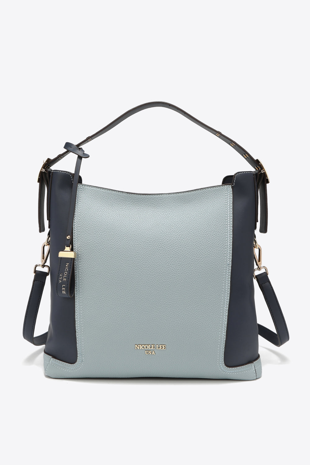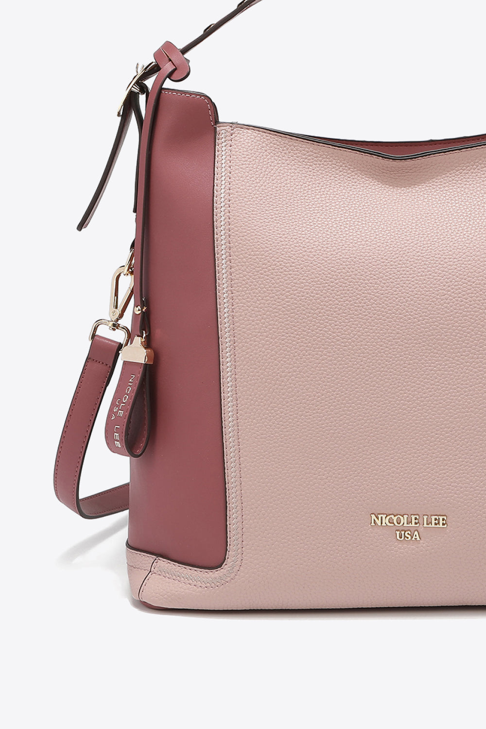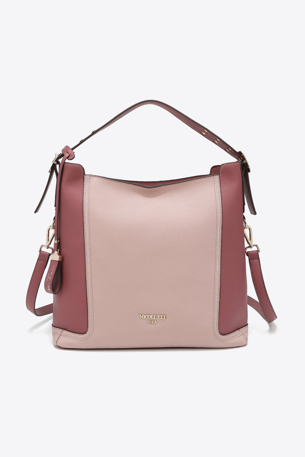 Crafted from high-quality vegan leather, this bag offers a luxurious look and feel while staying true to your ethical values. The adjustable shoulder strap allows for a customizable fit, with a drop range of 4 to 8 inches, ensuring comfort and convenience wherever you go. It features an authentic Nicole Lee circle charm, adding a touch of sophistication and elegance to the design. The removable strap is adorned with logo embossed lettering, showcasing the brand's attention to detail and commitment to quality. The recessed zip top closure ensures the security of your belongings while providing easy access to the bag's spacious interior. With a back zip pocket, you can conveniently store items that require quick retrieval. The bag also features D-ring buckles for strap attachments, allowing you to switch between different carrying options effortlessly. The bag's hardware is adorned with logo hardware lettering and engraved zipper pulls, adding a touch of glamour to the overall design. The gold-tone hardware complements the vegan leather exterior, elevating its aesthetic appeal.
