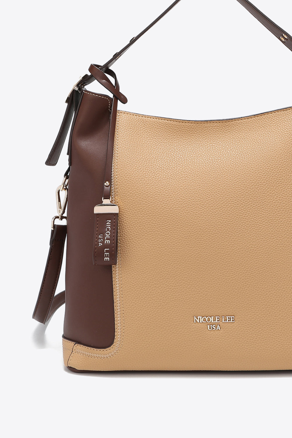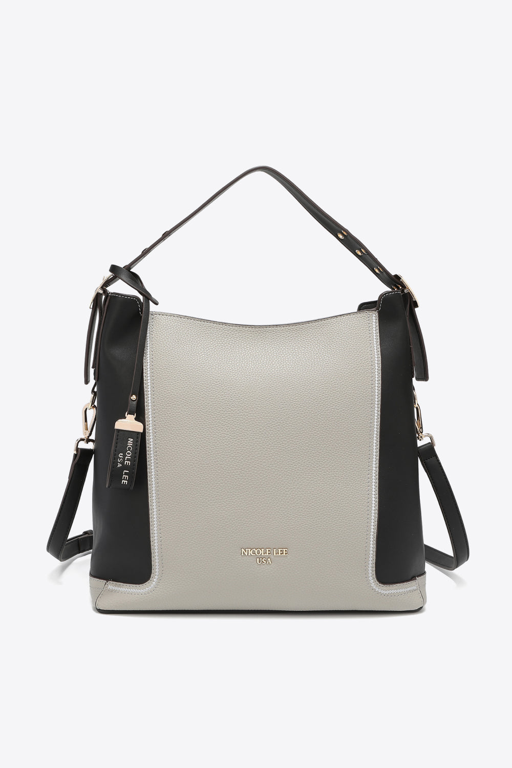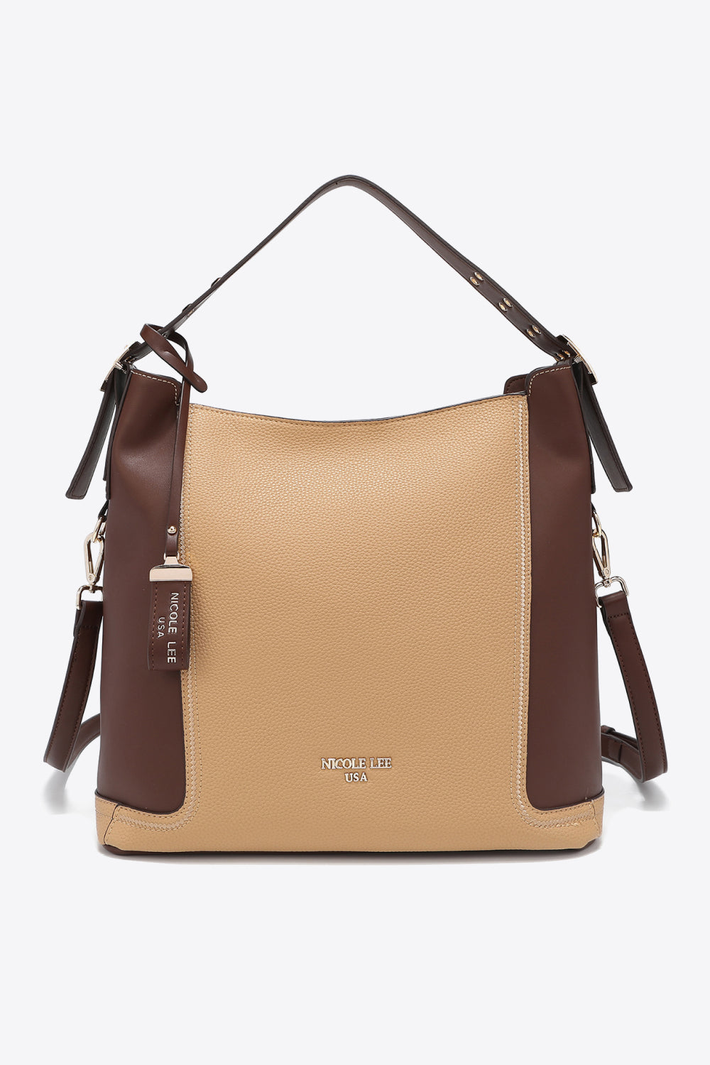Crafted from high-quality vegan leather, this bag offers a luxurious look and feel while staying true to your ethical values. The adjustable shoulder strap allows for a customizable fit, with a drop range of 4 to 8 inches, ensuring comfort and convenience wherever you go. It features an authentic Nicole Lee circle charm, adding a touch of sophistication and elegance to the design. The removable strap is adorned with logo embossed lettering, showcasing the brand's attention to detail and commitment to quality. The recessed zip top closure ensures the security of your belongings while providing easy access to the bag's spacious interior. With a back zip pocket, you can conveniently store items that require quick retrieval. The bag also features D-ring buckles for strap attachments, allowing you to switch between different carrying options effortlessly. The bag's hardware is adorned with logo hardware lettering and engraved zipper pulls, adding a touch of glamour to the overall design. The gold-tone hardware complements the vegan leather exterior, elevating its aesthetic appeal.