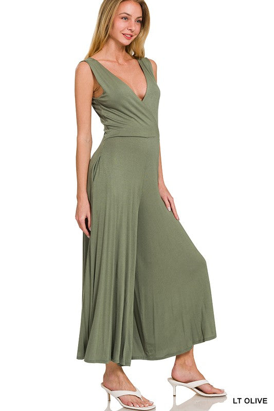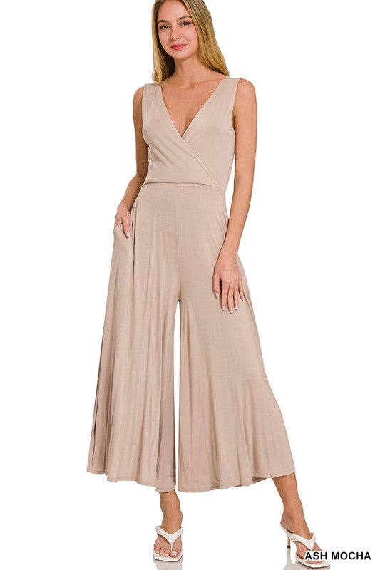The Surplice Neckline Sleeveless Jumpsuit exudes effortless elegance and modern sophistication. Featuring a surplice neckline, this jumpsuit offers a chic and flattering silhouette that accentuates your curves. The sleeveless design adds a touch of contemporary flair, perfect for warmer days or layering with a jacket for cooler evenings.