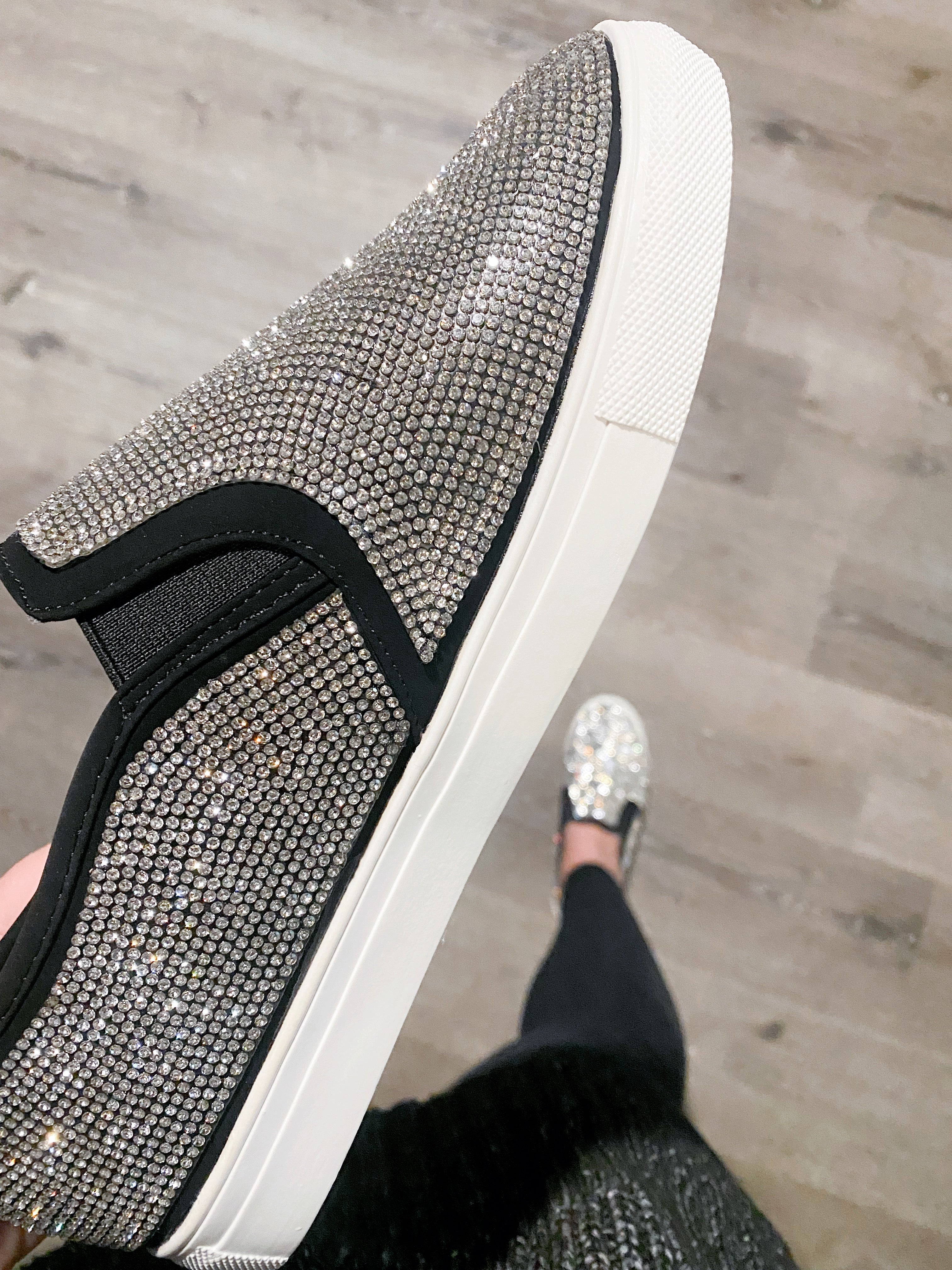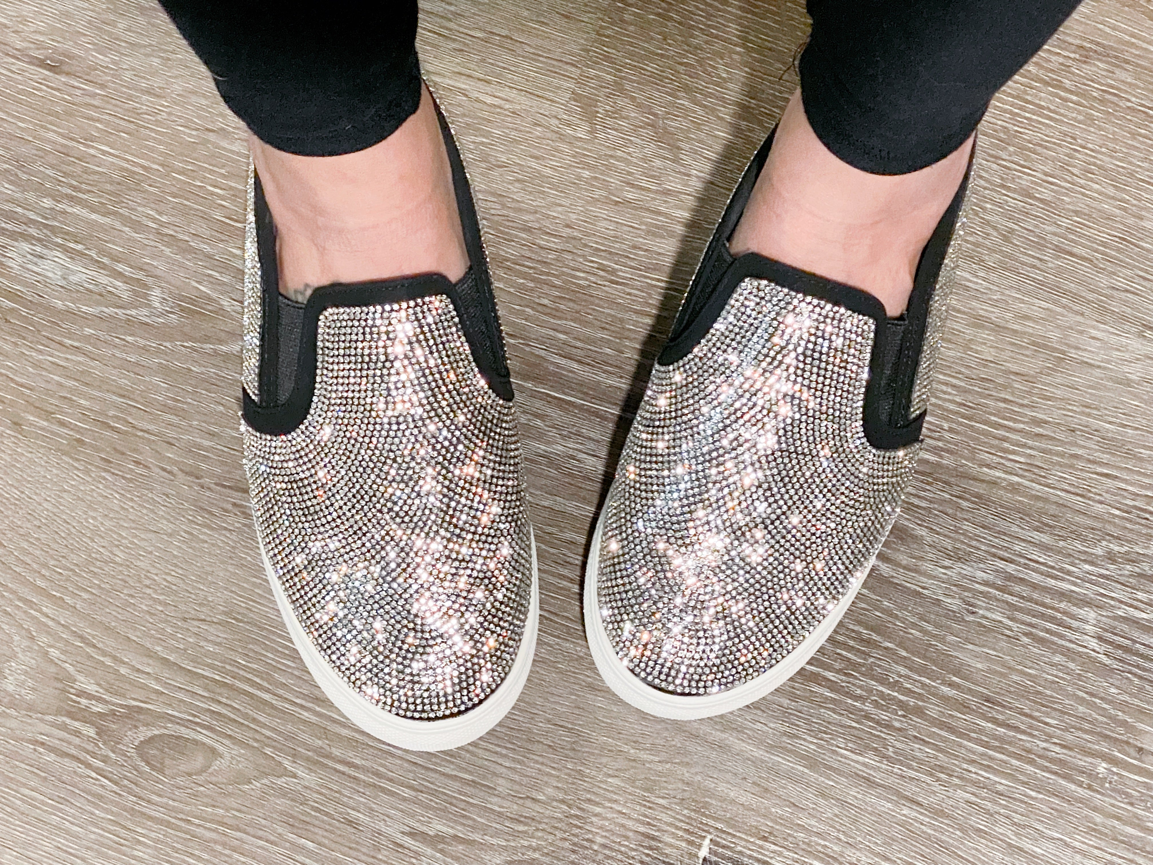 We are SO obsessed!  These have SO. MUCH. BLING.  Casual rhinestone slip on shoes are perfect for spicing up your every day outfits!  These fit true to size.