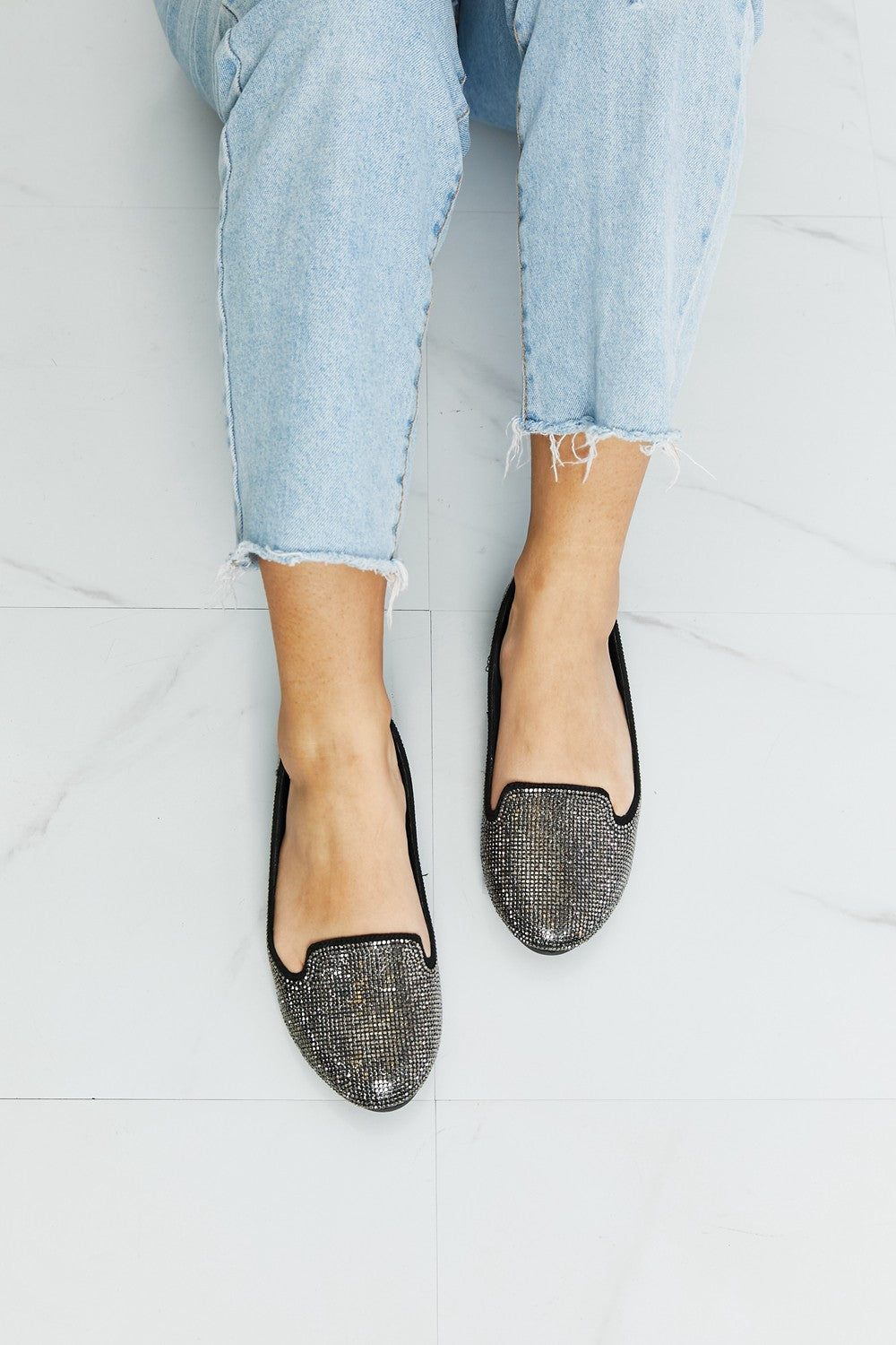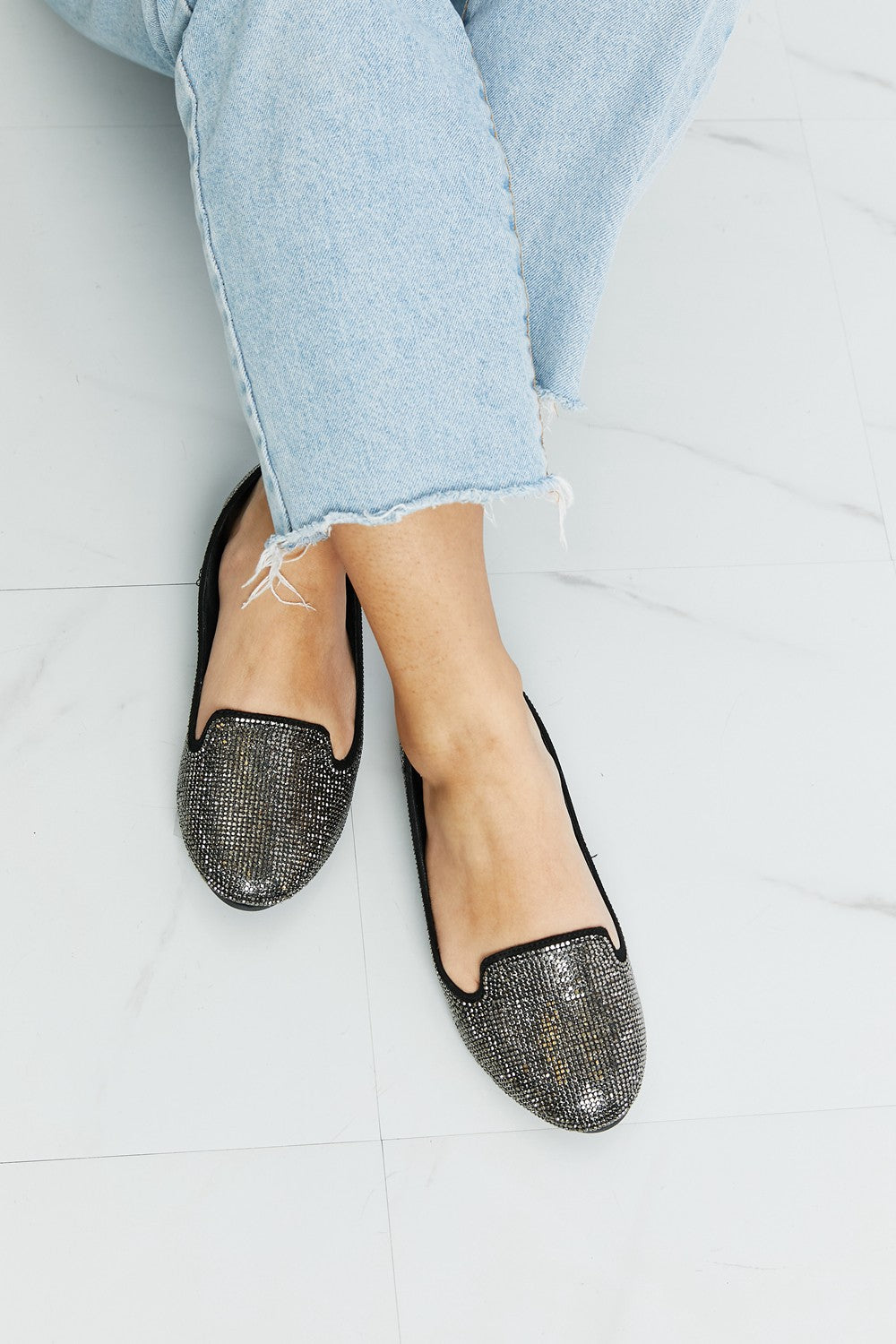 Forever Link Rhinestone Round Toe Flats in Black/Pewter